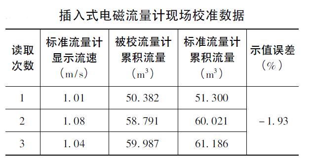 在插入式電磁流量計中設(shè)置實驗室可追溯性的儀器系數(shù),并在現(xiàn)場校準(zhǔn)DN800電磁流量計。 流量設(shè)定為1.0m / s,儀器系數(shù)K設(shè)定為1.3225。 首先,在現(xiàn)場管道上打一個在線孔,然后將插入式電磁流量計插入管道中,以確保探頭的安裝方向和插入深度與實驗室可追溯性一致。 最后,開始在線校準(zhǔn),以記錄標(biāo)準(zhǔn)流量計和校準(zhǔn)后的流量計在一段時間內(nèi)的累積流量,并計算出指示值的誤差。 表中顯示了現(xiàn)場校準(zhǔn)數(shù)據(jù)。