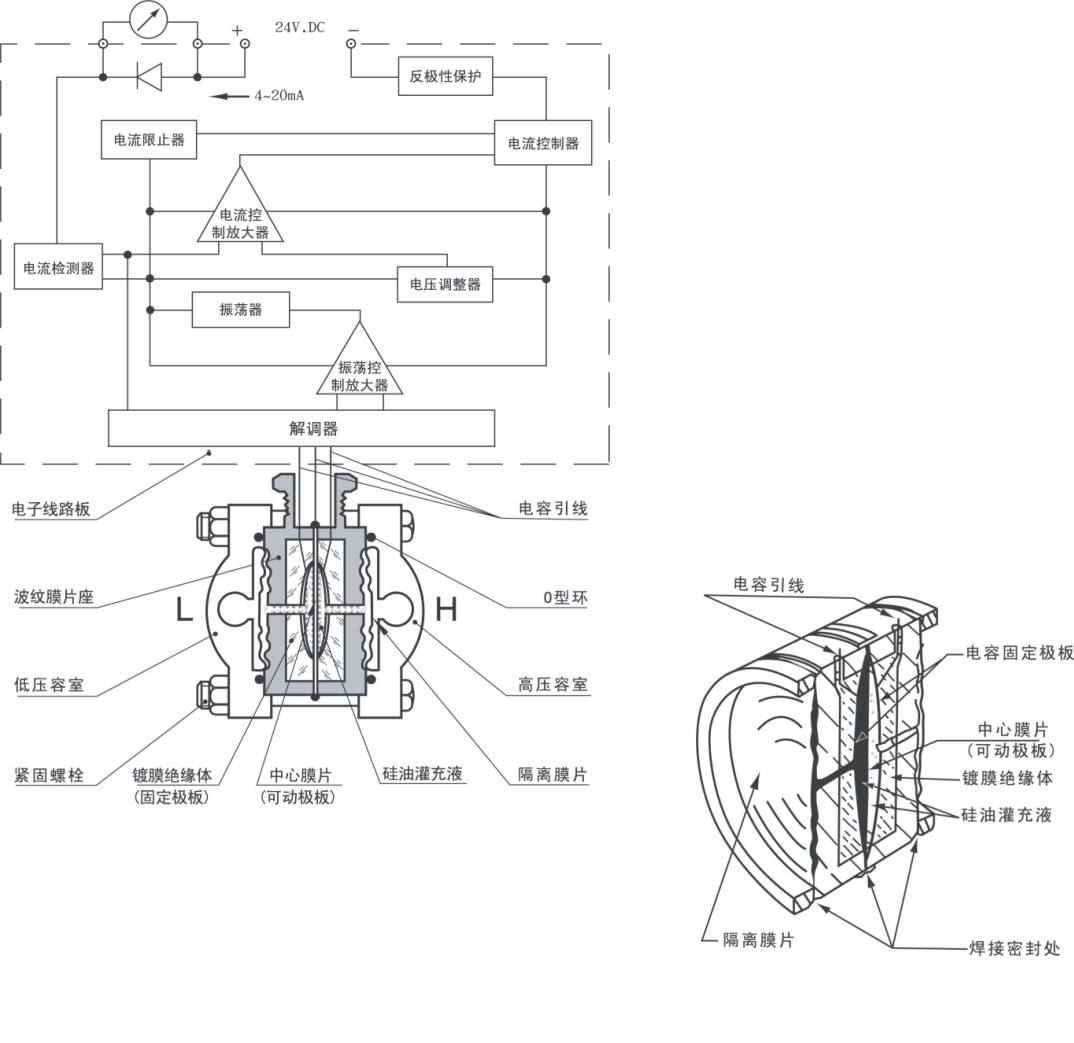 壓力變送器是由測量膜片與兩側(cè)絕緣片上的電極各組成一個