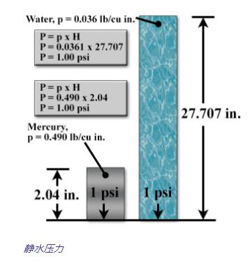 靜水壓力是一列液體底部由每單位面積的靜水壓力產(chǎn)生的壓力,這也可以稱其為壓頭或壓頭壓力,但是通常都被稱為流體的高度,例如水柱英寸,水銀英寸或水英尺。該測量取決于液體密度并且與容器的形狀無關(guān)。這是基于壓力等于密度乘以液體高度的特性。